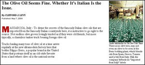 Nellincipit dellarticolo, si legge così: Per svelare i segreti dei famosi oli doliva italiani che vengono esportati dalla famosa campagna italiana, è deleterio andare direttamente alla fonte. Nessuna uliveta infinita, amabilmente curata come se fosse una vecchia amica; piuttosto unantiestetica auto-botte che trasporta olio di oliva straniero. Il giornalista Clifford J.Levy continua quindi raccontando come un noto esportatore italiano di olio di oliva possa vendere il suo prodotto facendolo passare per olio italiano pur utilizzando miscele di oli stranieri sul cui totale solo il 20% è veramente olio italiano. Colpa delle leggi e dei regolamenti che lo permettono, sia in Europa, sia negli Stati Uniti! (Il testo integrale, in inglese, si può trovare con una ricerca su Google inserendo le parole chiave new york times massarosa oil).