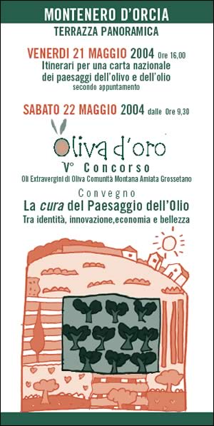 Il 21 e 22 Maggio, a Montenero dOrcia in provincia di Grosseto, lAssociazione Città Paesaggio organizza il secondo appuntamento per la promozione della Carta nazionale dei passaggi dell'olivo e dell'olio. In particolare, Venerdì sarà dedicato allincontro sul tema Itinerari per una carta nazionale dei paesaggi dellolivo e dellolio mentre Sabato, a partire dalle 9,30, si svolgerà il convegno La cura del Paesaggio dellOlio - Tra identità, innovazione, economia e bellezza. A seguire, il work-shop Olio L.E.A.D.E.R.+.