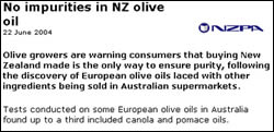 La notizia è della NZPA - New Zeland Press Association, agenzia della stampa associata nazionale, ed il cappello, subito dopo il titolo, recita così: Gli olivicoltori mettono in guardia i consumatori dopo la scoperta dellolio di oliva europeo contraffatto regolarmente venduto nei supermercati australiani: comprare olio della Nuova Zelanda è lunico modo per garantirsi la purezza del prodotto.