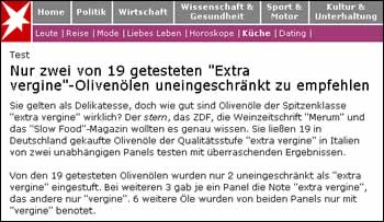 Lattacco di Stern al nostro prodotto più qualificato, più apprezzato e riconosciuto, più legato allidentità mediterranea ed italiana in particolare ci fa pensare. Larchitettura e la costruzione dellarticolo del settimanale tedesco non ci convince e siamo del parere che i produttori, gli imbottigliatori e gli importatori chiamati in causa debbano prendere una posizione chiara ed inequivocabile, contestando in maniera documentale i rilievi sollevati contro di loro ed esigere una adeguata riparazione al gravissimo danno arrecato non solo a loro, ma a tutta lolivicoltura italiana di qualità. E siamo del parere che lo debbano fare rapidamente e in maniera molto visibile.